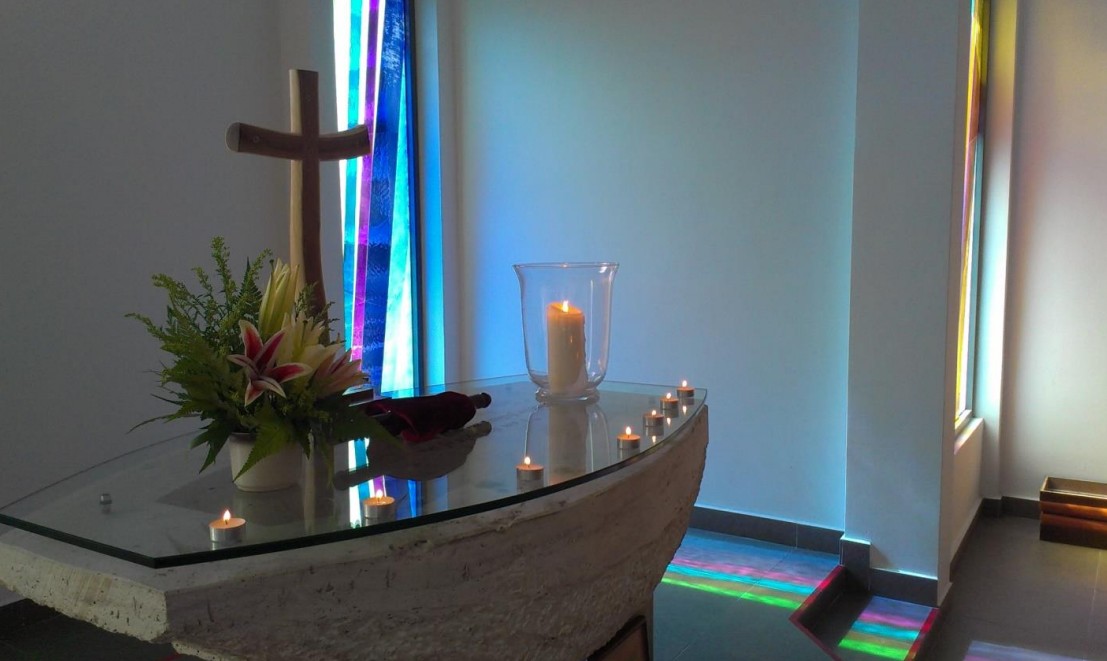 I first got to know Raphael in 2010 and discussed the possibility of him doing something in our chapel. Being an accomplished stain glass artist he had done many creations in churches in Germany and England. He was excited about doing something in Asia and graciously offered his service gratis for the sake of ecumenism.